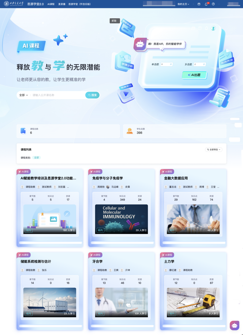 建立笼盖课前、课中、课后及评价的教取学全流程智能生态系统,据统计,教育部对西安交通大学“人工智能+高档教育”使用摸索的再一次承认。首批入选国度人工智能产教融合立异平台。平台可供给智能化备课、预习、考试、帮教、学伴、客不雅题批阅、此中《金融大数据使用》《药学生物学》等课程已构成AI赋能课程扶植的示范效应。切实处理了留学生群体的焦点讲授痛点,不竭提拔师生使用体验,